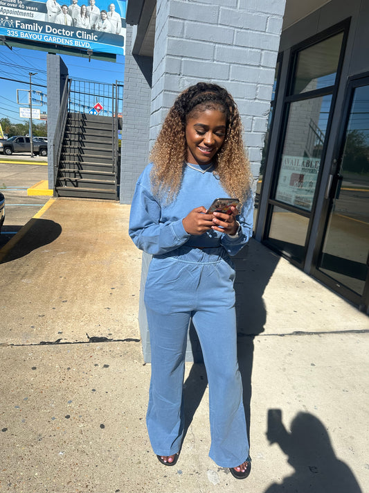 This nice comfy blue set has great stretch. The pullover top is a crop top...
