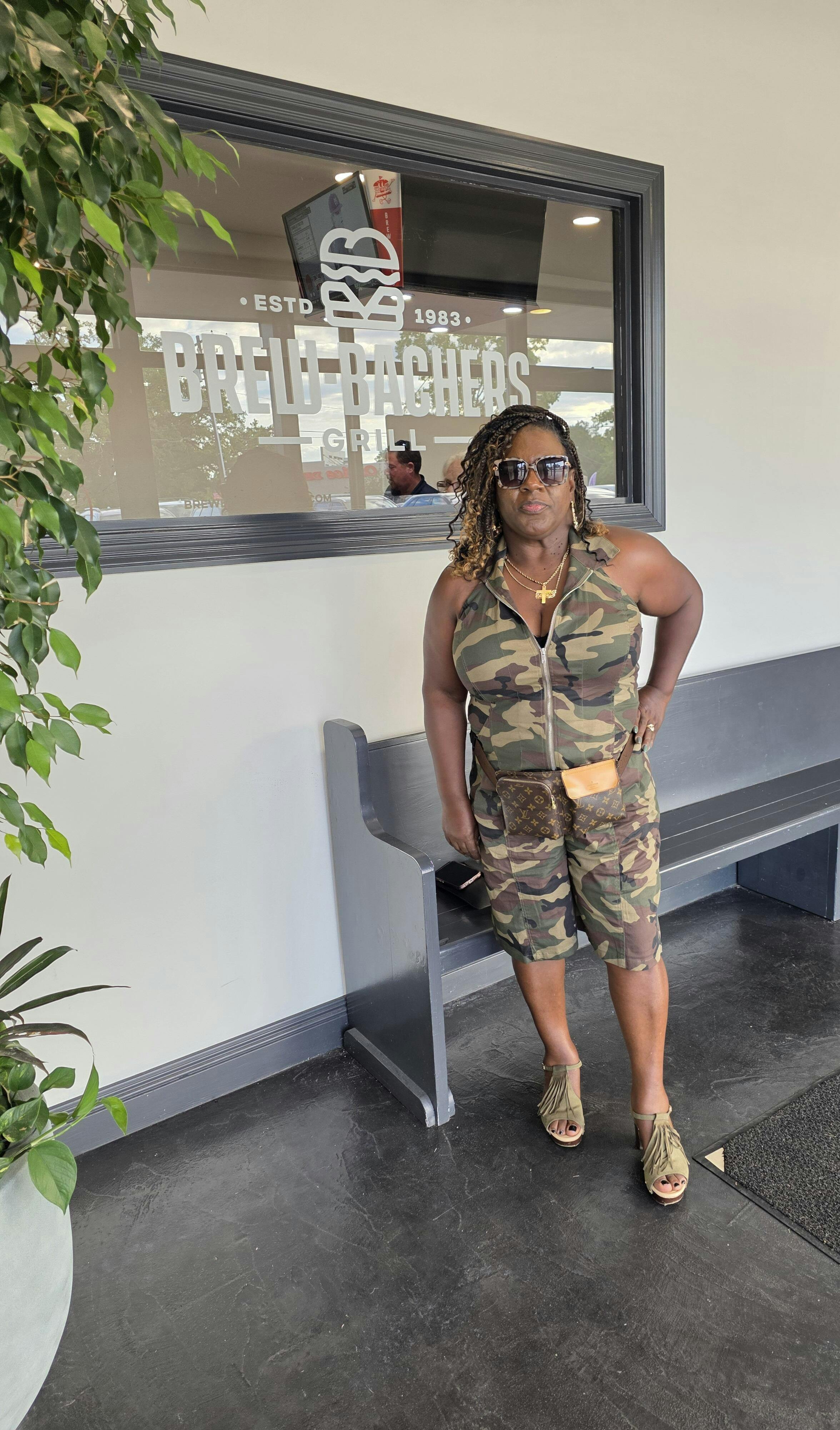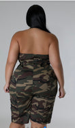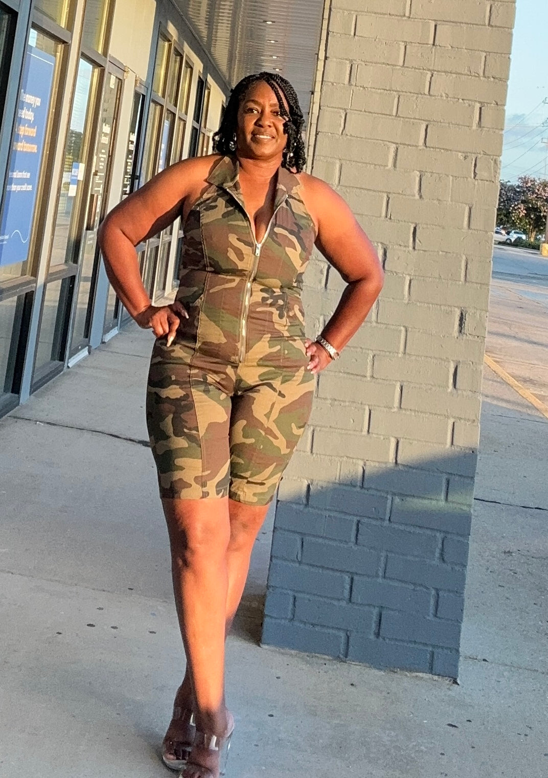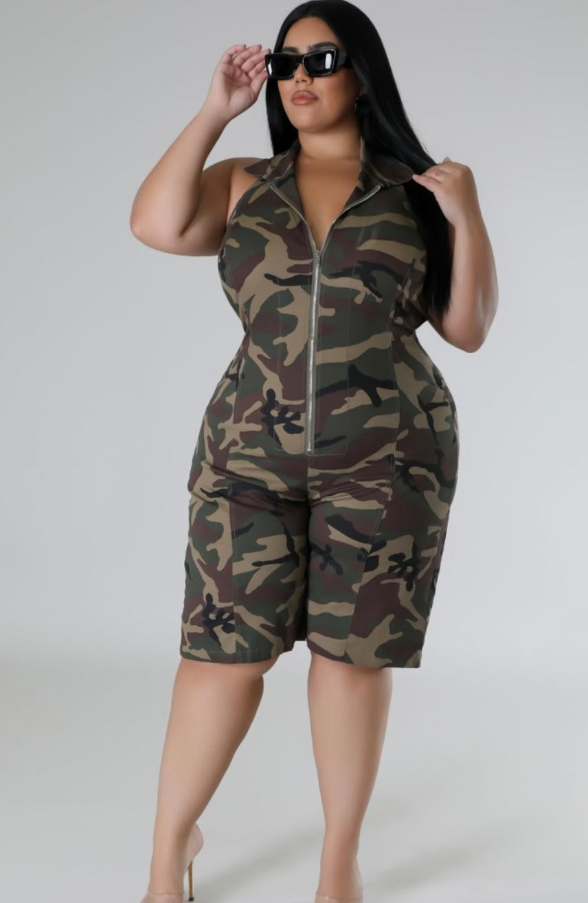 Camouflage Halter romper. Has little stretch. Fits true to size.